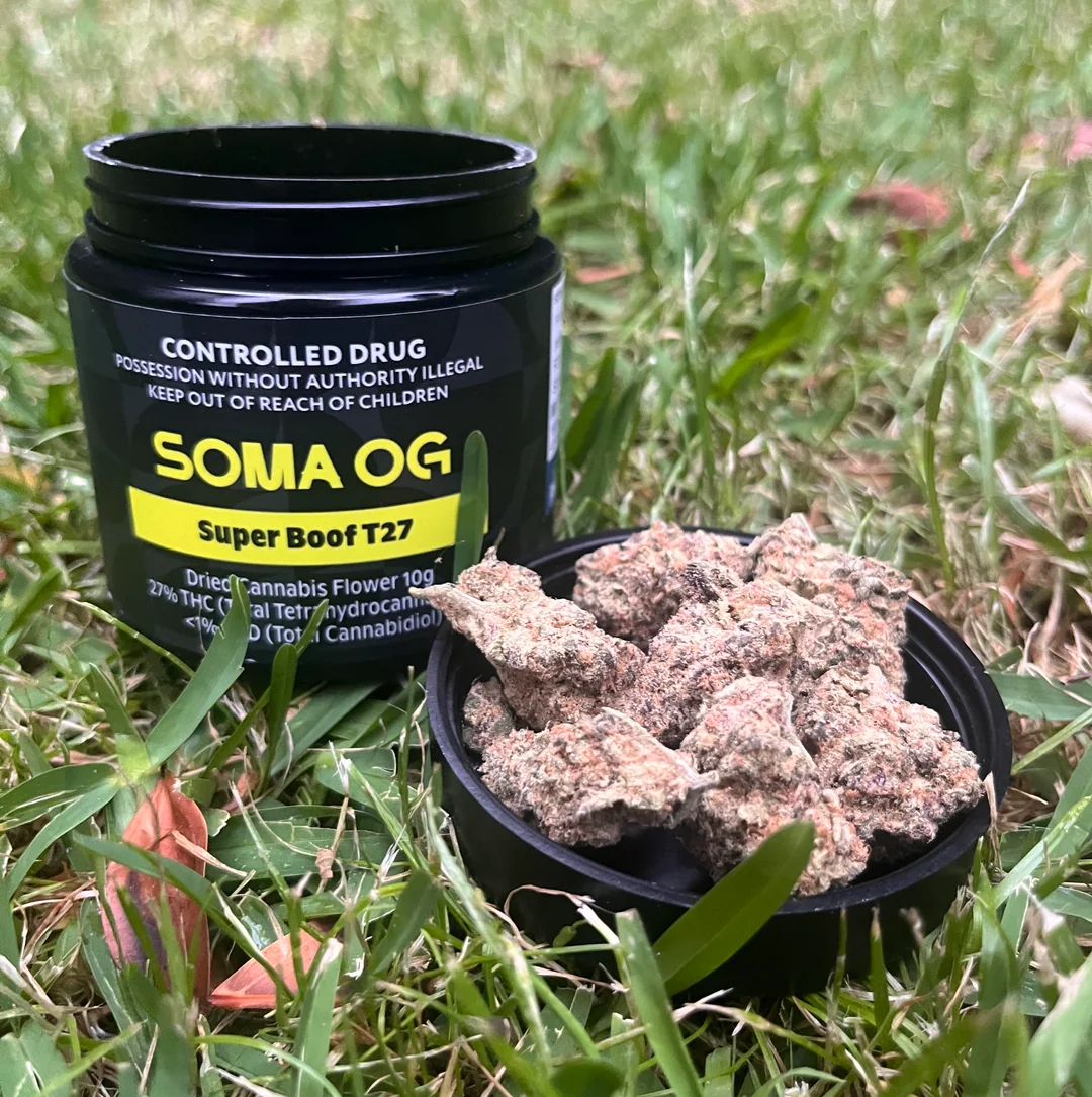 Soma OG Super Boof is a hybrid from Black Cherry Punch x Tropicana Cookies, coming in at 27% THC with basically no CBD.